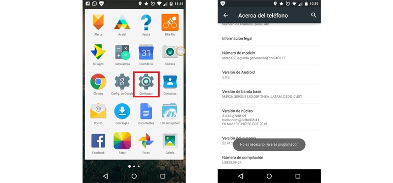 Ingresa a ‘Configurar’ y baja hasta ‘Acerca del teléfono’. Da siete toques en esa sección para que se active la opción ‘Programador’.