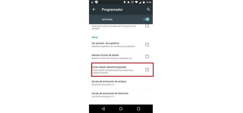 Ingresa a ‘Programador’ y busca la sección ‘Dibujo’. Ahí elegimos el ítem ‘Forzar diseño derecho/izquierda’ y listo.