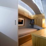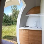 Esta vivienda modernista es un pequeño departamento, en forma de huevo – sí, un poco más amplia que las cápsulas en las que viajaban los Sayayines 😉 – de 4.5 metros de largo, 2,4 metros de ancho y 2.5 metros de alto. En su interior cuenta una cama, cocina, ducha, inodoro, una mesa para comer o trabajar, lavaplatos y sectores de guardado. ¿Práctico, no?