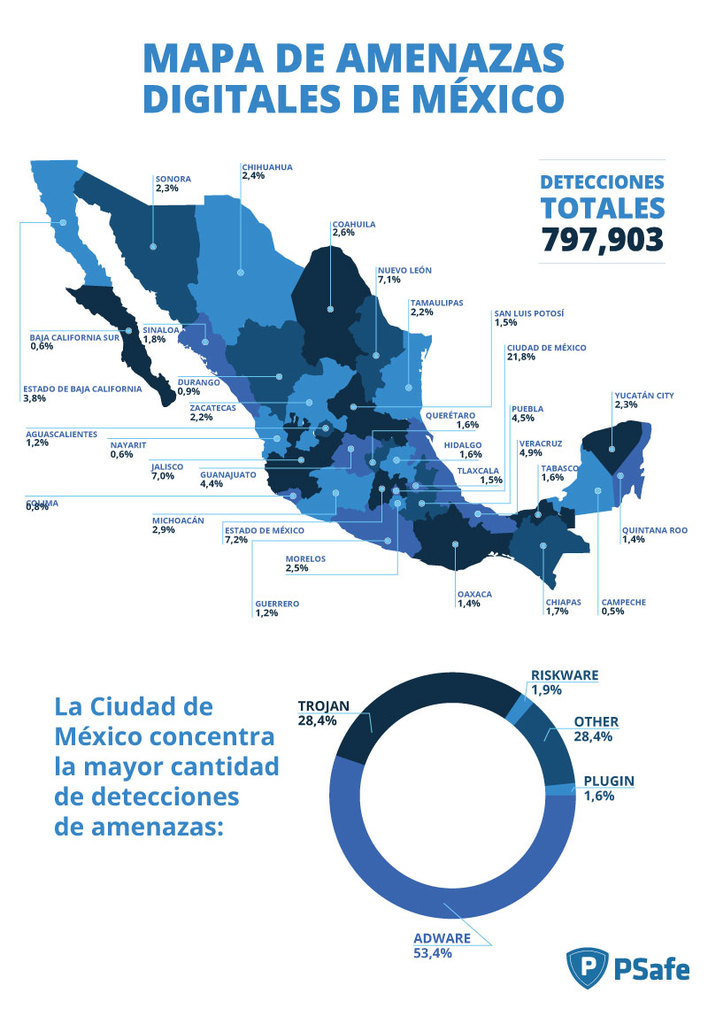 Según el ‘Mapa de Amenazas Digitales de México”, elaborado por el laboratorio de malware de PSafe Tecnología, en noviembre se detectaron 797,903 amenazas cibernéticas de tentativas de infección por malwares en dispositivos Android en México, siendo la Ciudad de México el lugar que concentra la mayor cantidad de detecciones maliciosas en el país con un 22,8%.