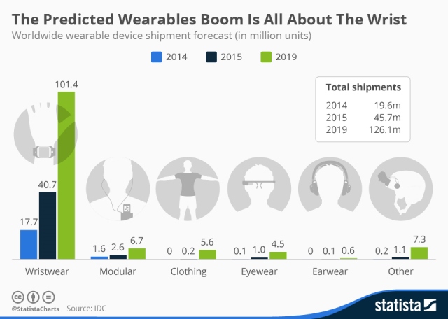 Recientes estudios de IDC muestra que la previsión está correcta. De acuerdo con la expectativa de la empresa de análisis de datos, el mundo de los aparatos vestibles debe pasar de US$ 19.6 millones en el 2014 a 45.7 millones en el 2015, alcanzando 126.1 millones en el 2019.