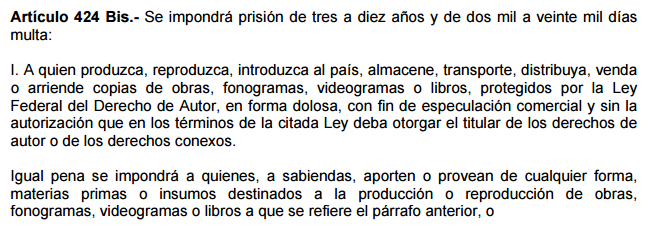 Aquí está un extracto del Código Penal Federal, disponible en el sitio del Instituto Nacional de Derechos de Autor: