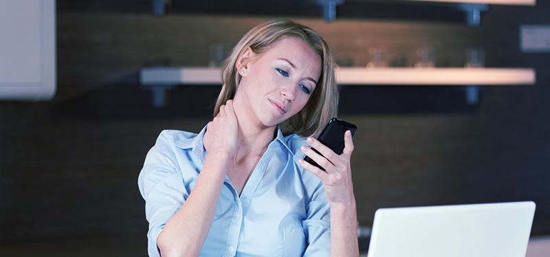 Es fácil entender el porqué. Cuando navegamos en internet y cambiamos mensajes usando el celular, nuestra tendencia es bajar la cabeza en un ángulo pronunciado, lo que aumenta hasta seis veces el peso sobre nuestro cuello y, con esto, la presión sobre él, que normalmente varía entre cuatro a cinco kilos, llega hasta 30, una sobrecarga que puede causar serios problemas.