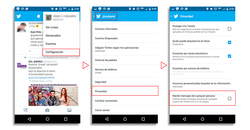 Uno de los últimos cambios importantes en Twitter permite que cualquier persona pueda contactarte por mensaje directo aun cuando tú no sigas su cuenta. Afortunadamente esta opción puede ser desactivada para que sólo te comuniques con quienes has decidido mantener comunicación.