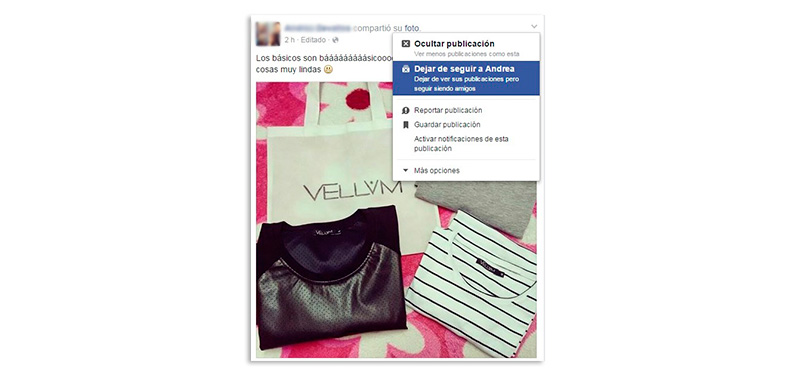 Si de pronto tienes amigos que publican cosas que no te gustan, la forma más sencilla de dejar de leerlos sin tener que eliminarlos es dando clic en la flecha que apunta hacia abajo en la esquina superior derecha de cada publicación vista desde tu News Feed.