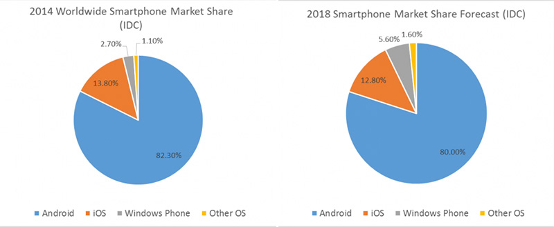 Mira abajo el porcentaje de cada sistema en smartphones, y su estimación para el 2018.