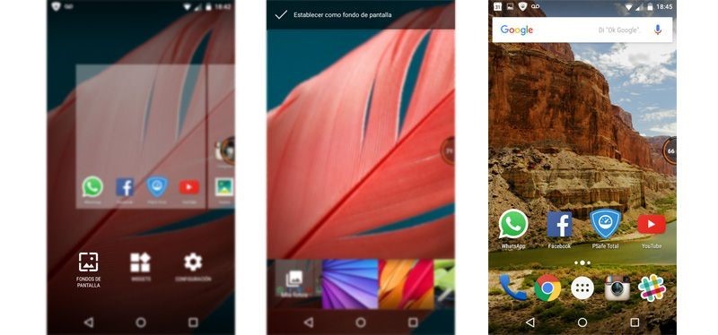Si estás cansado de ese fondo de pantalla lúgubre o muy formal, pues intenta cambiarlo. Presionando sobre la pantalla de tu celular aparecerán tres opciones, tal y como se ve en la imagen, toca en ‘Fondos de pantalla’.