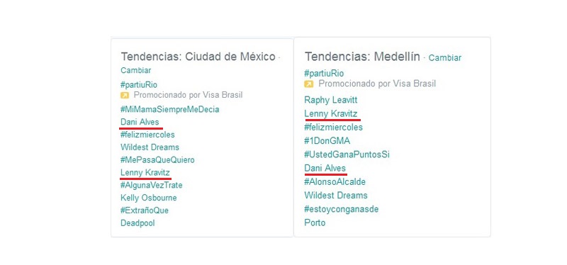 En las siguientes imágenes vemos como los ‘trending topics’ de la Ciudad de México y Medellín, extraídos hoy en la mañana del miércoles 05 de agosto, existen dos temas ‘noticiosos’ que se repiten, mientras que el resto son totalmente diferentes.