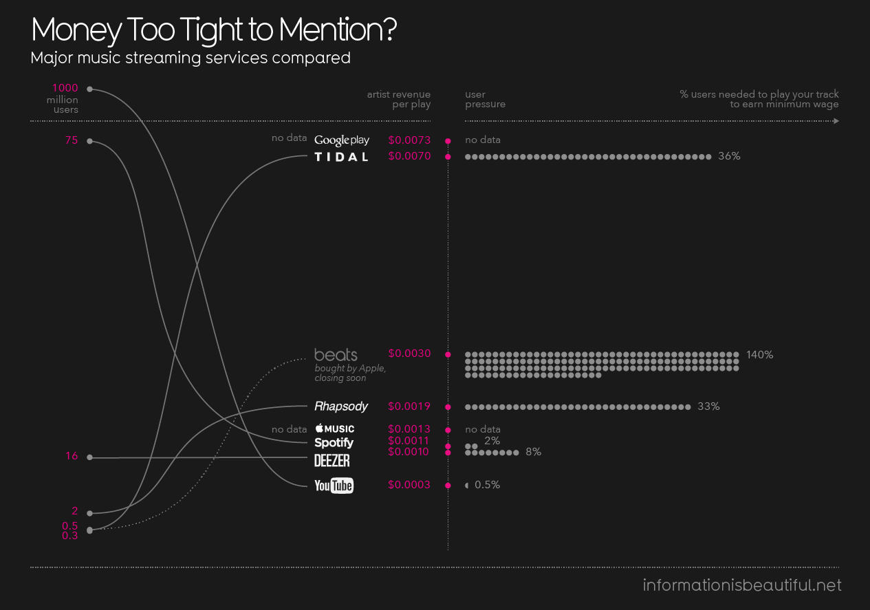 Es por eso que el sitio Information Is Beautiful se dio a la tarea de armar esta infografía del autor David McCandless, en el que se muestra la relación entre distintas plataformas de streaming de música y la ganancia que generan a los artistas. ¡Observa!