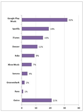 De los entrevistados, el 32% dijo que oye música en Google Play Music, mientras que el 19% escucha su música favorita en Spotify. Otro 15% utiliza iTunes, 11% Deezer y el gráfico abajo muestra que algunos prefieren otras plataformas cómo Rdio y Xbox Music.