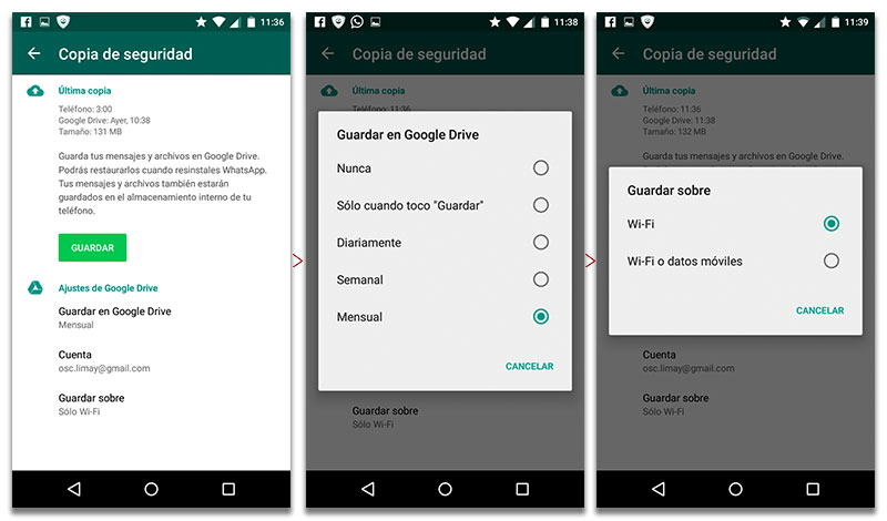 Whatsapp te da la opción de realizar la copia de seguridad dando clic en ‘Guardar’. Sin embargo, también puedes configurar el sistema para que dicho backup se realice en periodos semanales, diarios, mensuales o cuando tú lo decidas.