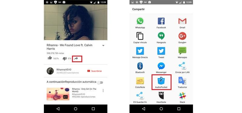 Una vez instalada, sólo debes abrir la aplicación de YouTube y elegir la canción o música que deseas reproducir. Seguidamente da un toque en la opción compartir y selecciona AudioPocket.