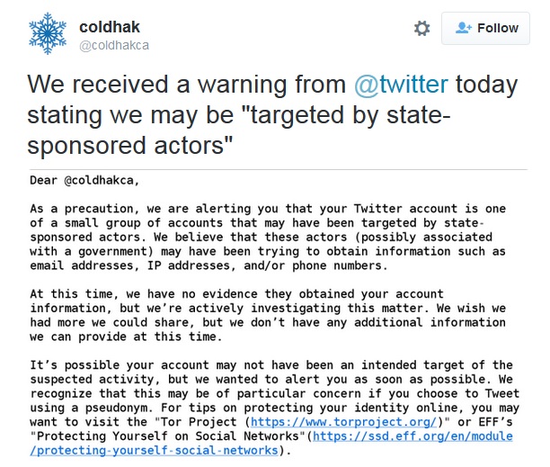 Twitter, la popular red social de microblogging, mandó un mensaje de advertencia a algunos de sus usuarios, comunicándoles que podrían haber sido víctimas de un hackeo por parte de autoridades gubernamentales.