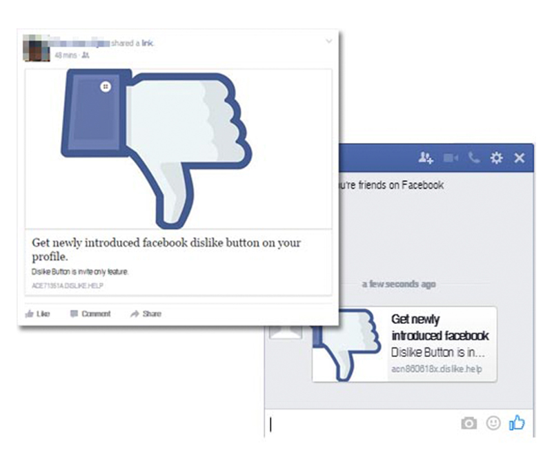 La siguiente imagen compartida por Hackread muestra un ejemplo de estos ataques que se muestran bajo la frase “Consigue el nuevo botón de No me gusta presentado por Facebook en tu perfil”.