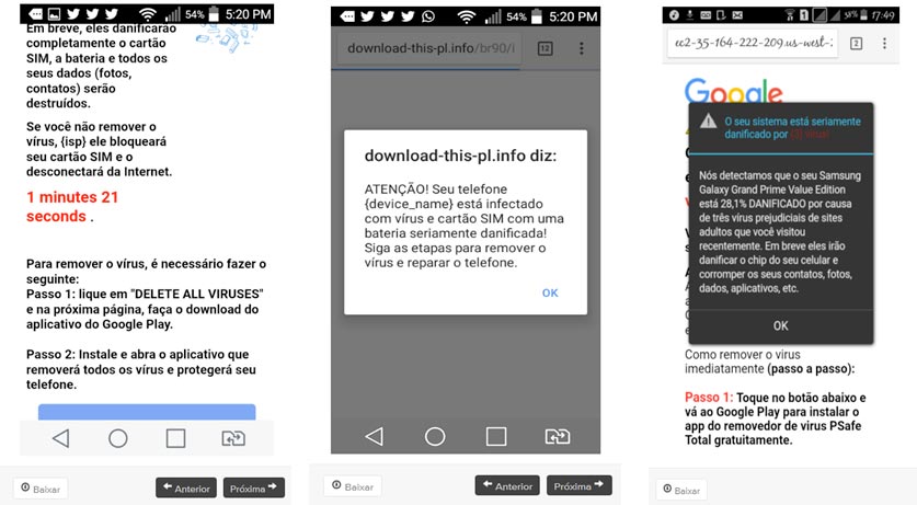 VocĂȘ recebeu um suposto âalerta de vĂrusâ ou outra publicidade aparentemente suspeita que redirecionou vocĂȘ para uma pĂĄgina de download na Google Play? Caso sim, essa pode ser uma publicidade falsa que nĂŁo foi criada pela PSafe. Ăs vezes, terceiros nĂŁo autorizados criam publicidade ou anĂșncios falsos, atĂ© mesmo utilizando a logomarca da nossa empresa e um link para nossa pĂĄgina na Google Play, com o objetivo de enganar os consumidores. Seguem alguns exemplos: